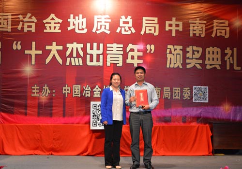 54日青年节,中南局团委在局大礼堂举办了中国冶金地质总局中南局首届“十大杰出青年”颁奖典礼,公司王昭荣获“十大杰出青年”荣誉称号,主持人采访了他这些年扎根基层、奉献青春的心路历程,局团委副书记刘文秀为其颁奖祝贺。
