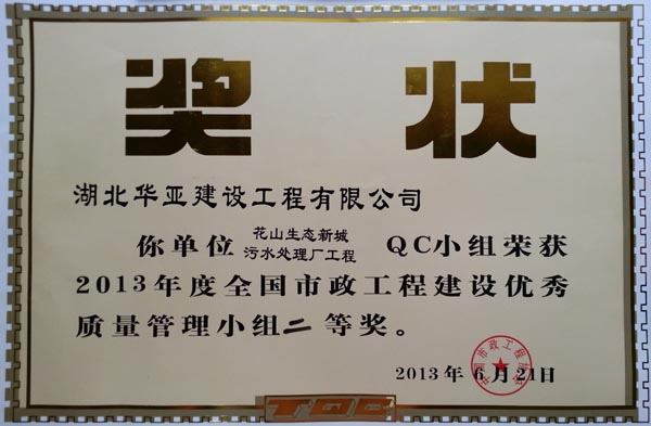 2013年度花山生态新城污水处理厂工程QC小组荣誉证书(全国市政工程协会二等奖)