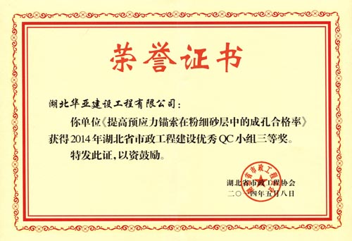 公司《提高预应力锚索在粉细砂层中的成孔合格率》获2014年湖北省市政工程建设优秀QC小组三等奖
