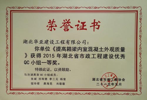 公司《提高箱梁内室混凝土外观质量》获15年度省市政协会QC一等奖